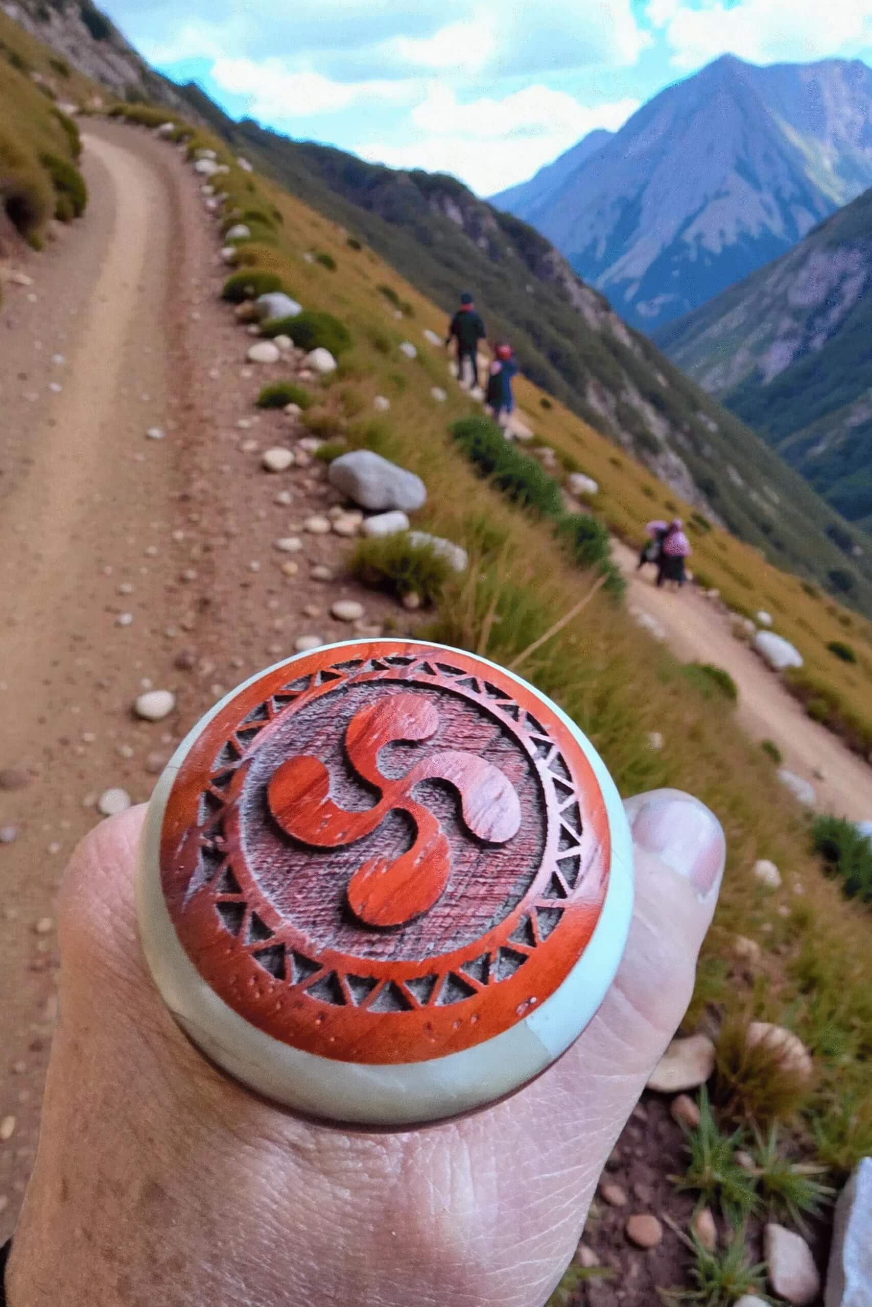 Un pommeau en bois et en os, façonné dans notre atelier, habille le haut du bâton. C’est un appui confortable qui épousera le creux de la paume de votre main. Nous pouvons le graver de différents symboles, croix basque, croix occitane, coquille Saint-Jacques, initiales, blason, sanglier, bécasse, etc…
