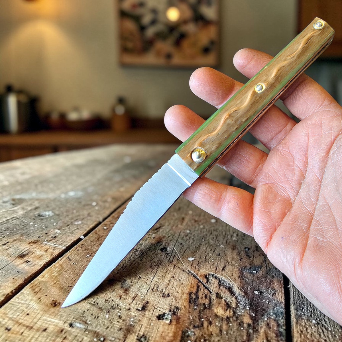 La lame de forme Yatagan est en acier inox 12c27 et le manche en véritable néflier scarifié bordé de résine pour renforcer le bois. Le ressort et la lame sont guillochés, ciselés dans notre atelier artisanal.