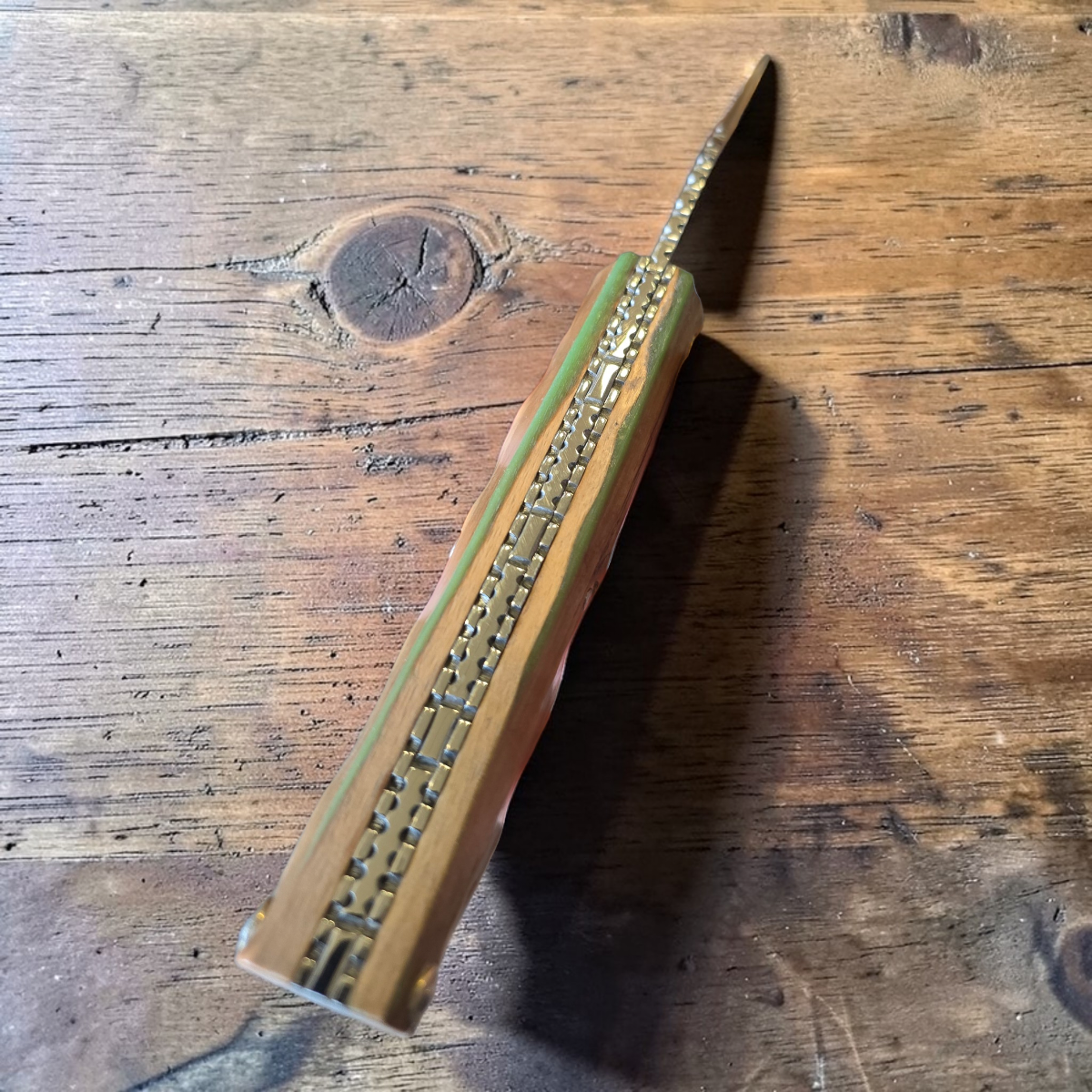Couteau basque pliant en néflier scarifié, le bois des Makilas ou Makhilas, le célèbre bâton des basques. Le bois utilisé provient d’un atelier familial de fabrication de Makilas au Pays Basque.