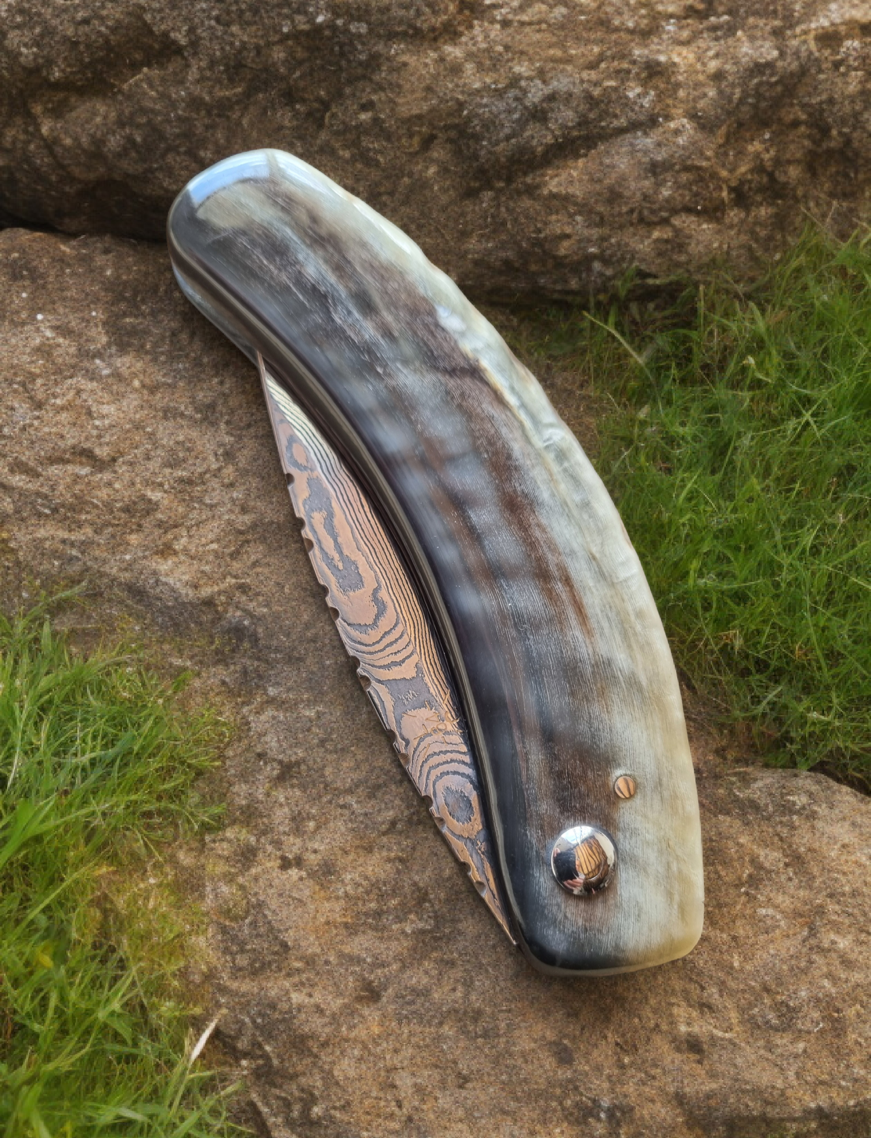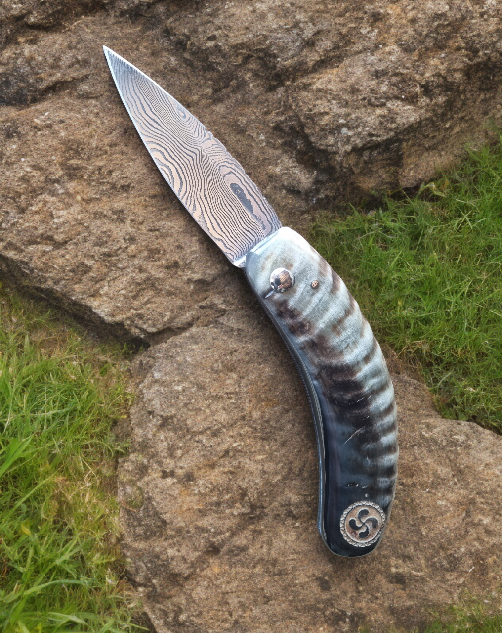 Lame acier Damas carbone de 128 couches forgée main. Manche en corne de brebis basque gravé de la croix basque (Lauburu).