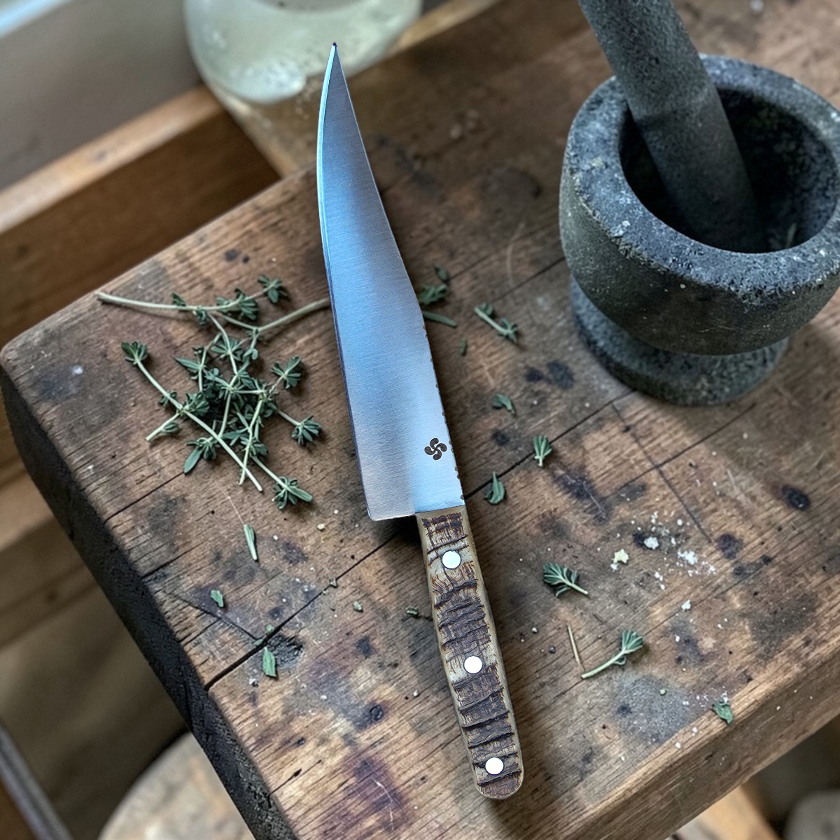 Sa lame en acier inoxydable 12c27 est guillochée sur le dessus de 7 « S » représentant les sept provinces basques.
