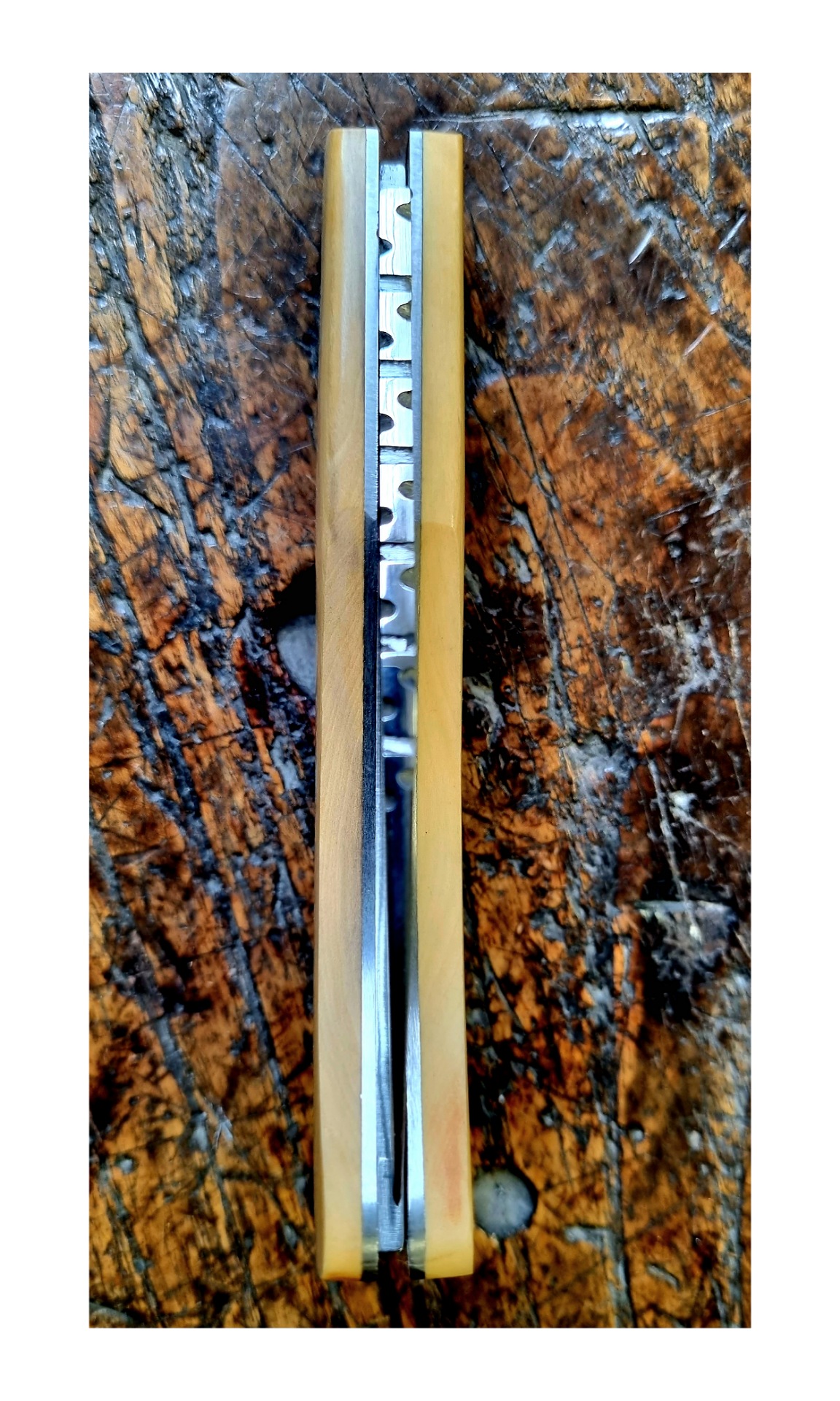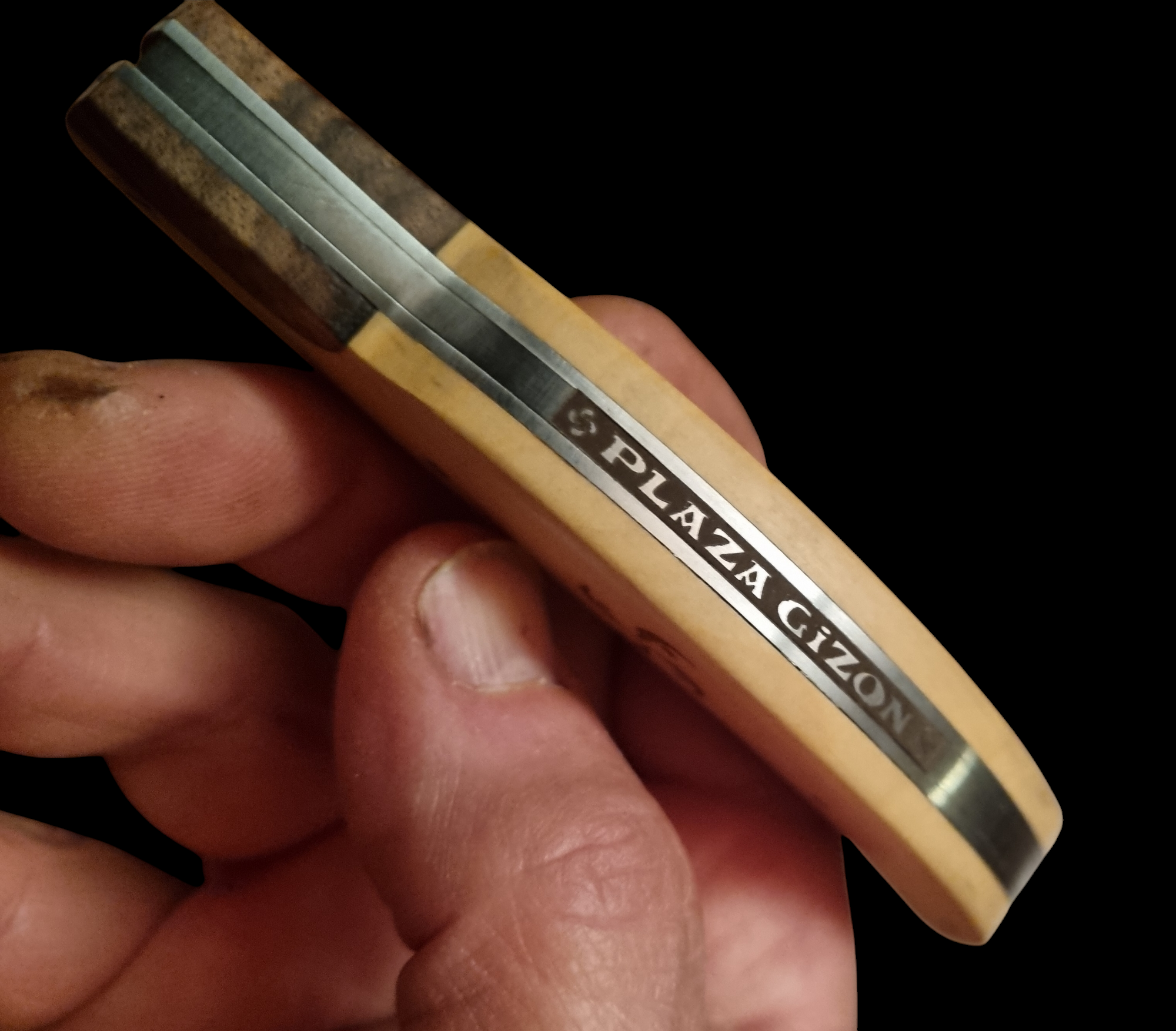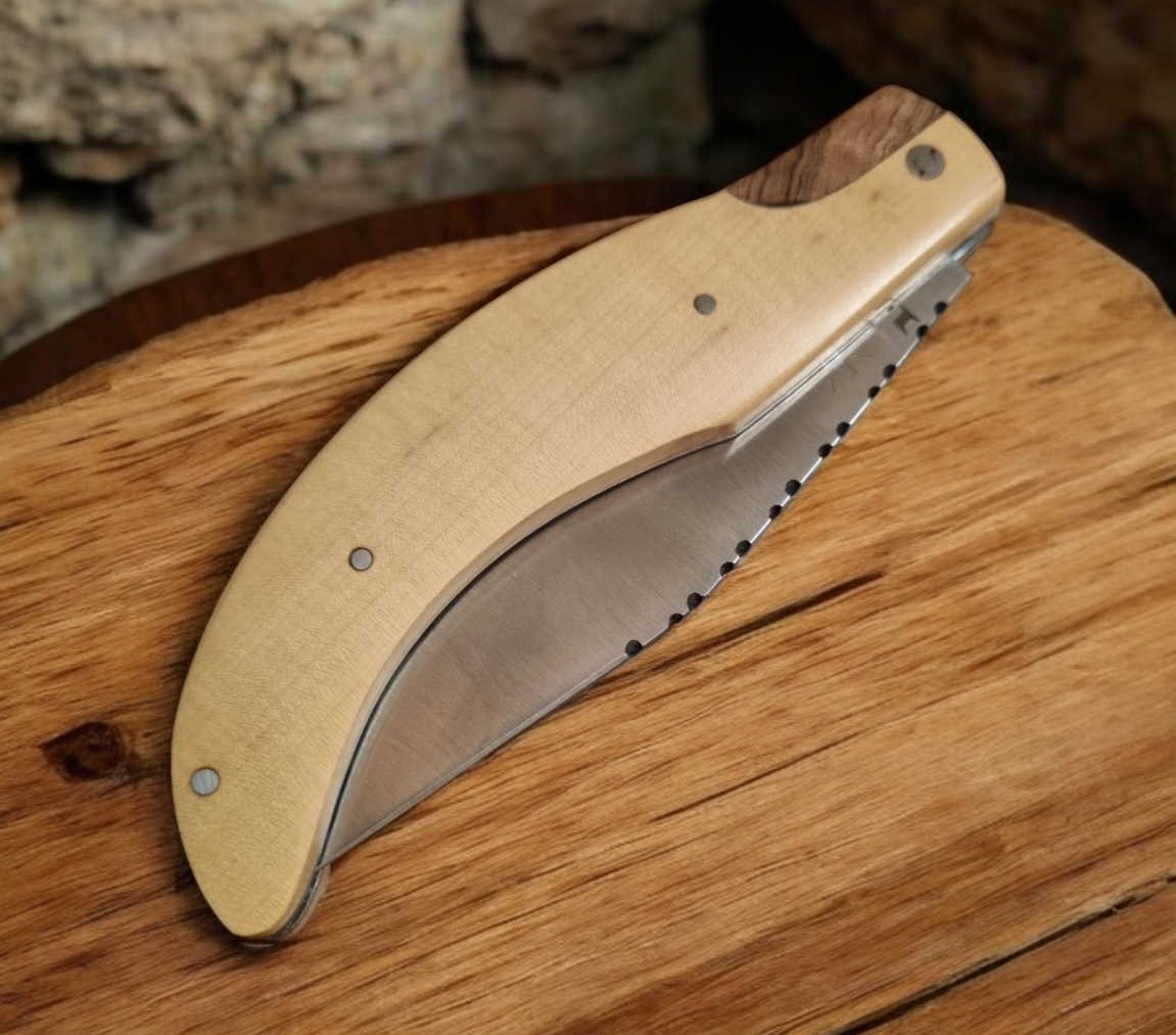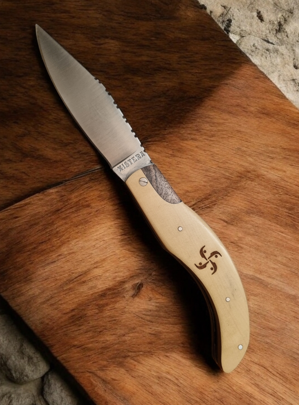 Ce couteau est inspiré de la forme du chistera, le gant en osier du joueur de pelote basque. Lame de forme yatagan guillochée sur le dessus de 7 « S » représentant les 7 provinces basques.