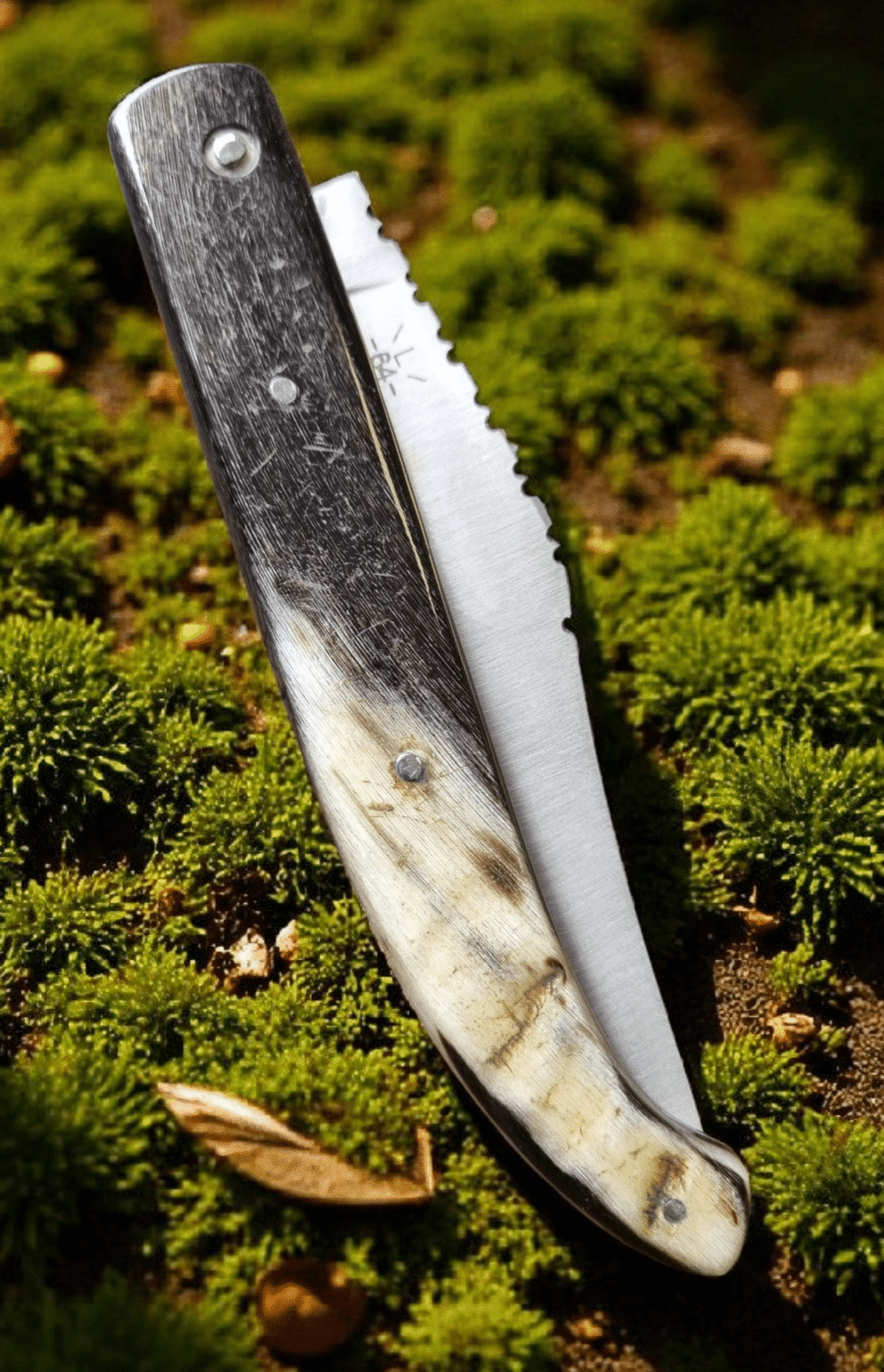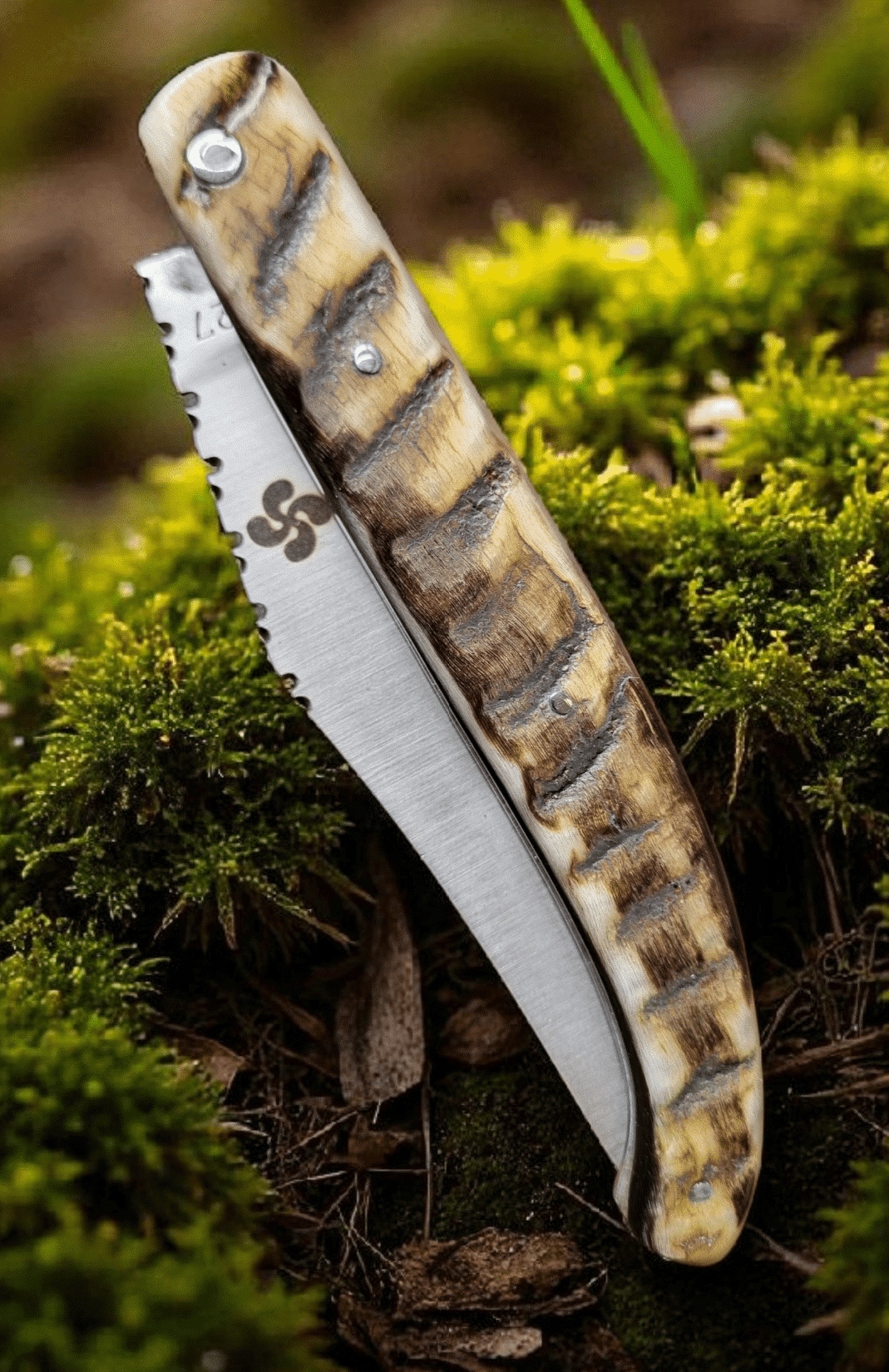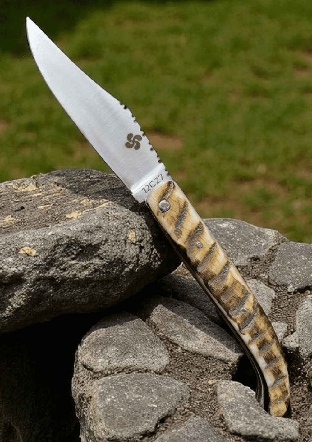 Lame de forme yatagan reprend celle des navajas (couteaux pliants traditionnels) espagnols. Manche en corne de brebis basque. Lame en acier inox 12C27. Guillochage de la lame.