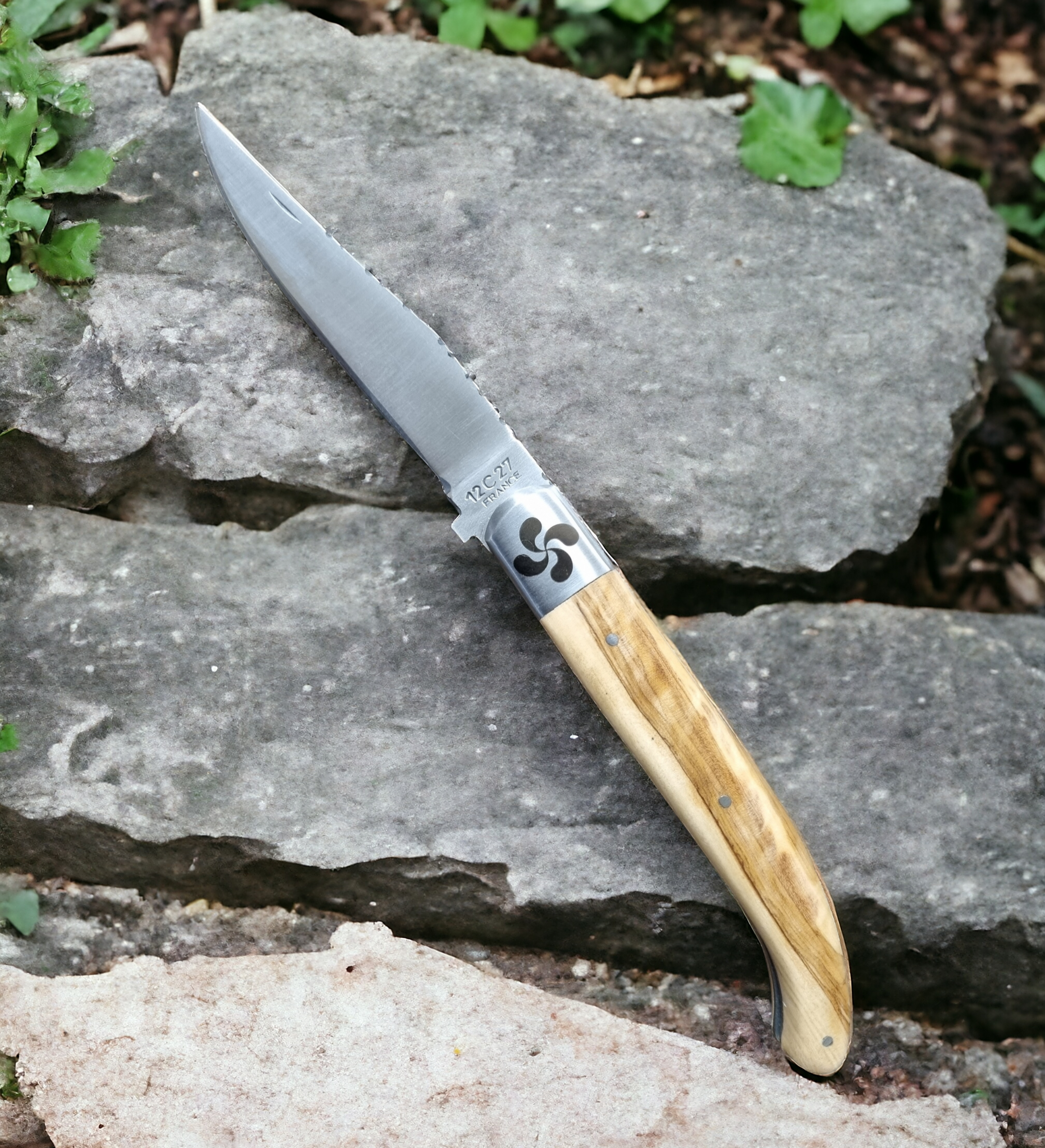 Lame de forme yatagan. Manche en olivier de Saint Jean de Luz. Système à cran carré. Lame en acier inox 12C27. Guillochage de la lame avec 7 « S » représentant les 7 provinces basques.